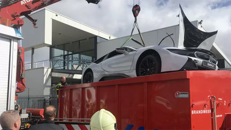 然而,如果高压电池着火,将会释放出额外的燃烧产物,如氢氧化锂。这些火灾可以用水扑灭,但这可能需要几天时间,并且需要大量的水。因此,在各个国家,人们使用可以浸没电动汽车的水箱来扑灭燃烧的电池。通过冷却电池,他们试图阻止导致电池再次复燃的化学过程。火焰很快被扑灭,但电池内部的反应会使电池持续升温。如果着火的车辆连接在充电站上,请关闭充电站或拔下电缆。这将阻止电流流向车辆,从而可以安全地扑灭火灾。